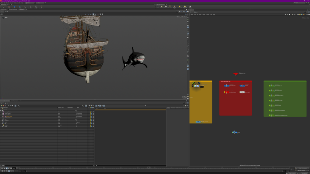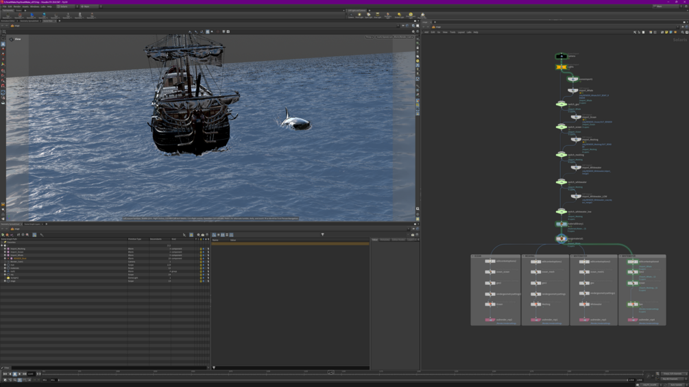 This project exemplifies advanced fluid simulation techniques in Houdini 20.0++, emphasizing the creation of custom water meshes, FLIP and white water simulations, and strong scene organization practices. Rendering with Karma combines all these elements, producing a visually stunning and realistic simulation of a ship interacting with water. This setup showcases the power of Houdini and Karma and serves as a comprehensive guide for managing complex VFX projects efficiently.